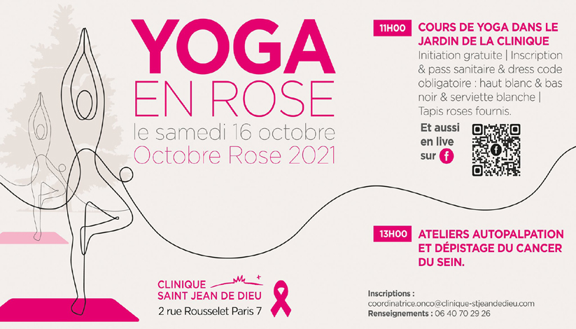 Ouvert à tous, le samedi 16 octobre, un cours de yoga gratuit et collectif sera donné dans le magnifique jardin de la Clinique Saint Jean de Dieu spécialisée en cancérologie, suivi d’ateliers d’auto-palpation (2 rue Rousselet – Paris 7e).