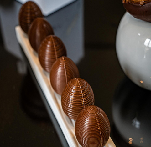 L’oeuf brioché feuilleté aux volutes caractéristiques du travail de Michael Bartocetti. Derrière ce feuilletage craquant une délicieuse saveur de vanille torréfiée laisse place à une ganache chocolat.