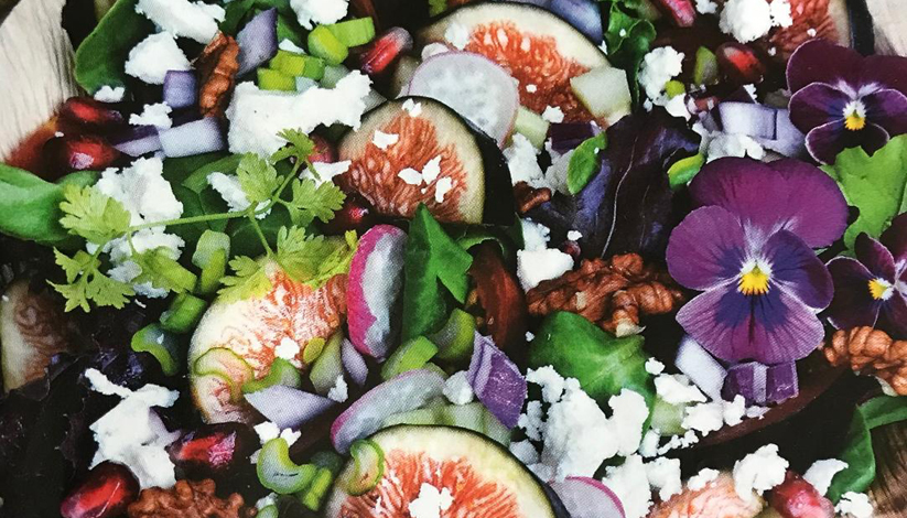4 – Répartissez le mesclun dans des assiettes. Arrangez les tomates, les figues, les radis, les cébettes et l’oignon.